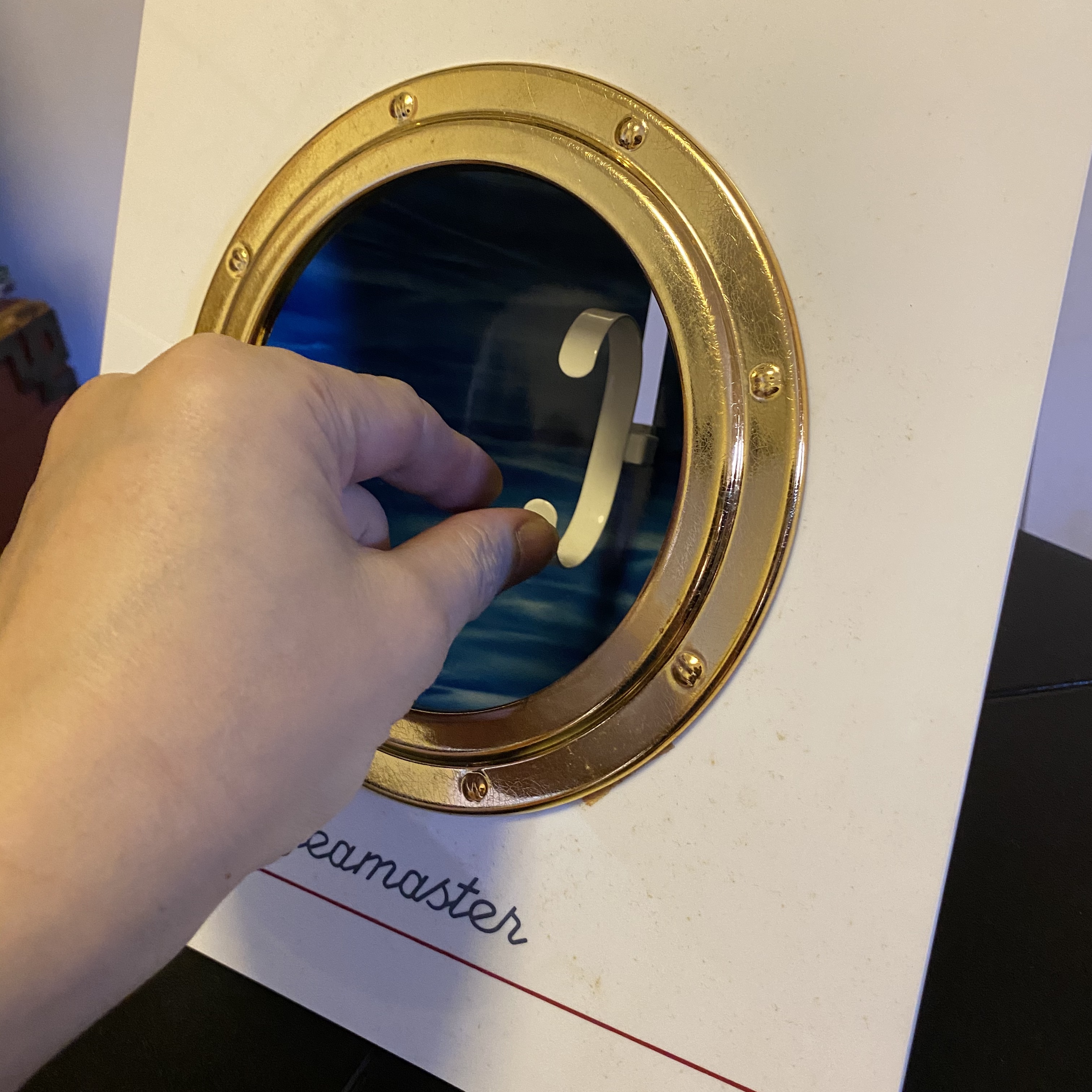 This is a very Interesting Original Vintage Omega Seamaster POTHOLE display with its original removable watch holder. As you are aware Rolex also has the similar pothole display for its Submariner range of watches. Very nice vintage condition throughout.Perfect for displaying your precious Omega Seamaster range of watches from Seamaster 30, 100, 120, 200, 300, 600, etc !!!! Made of hard plastic with brass tone pothole frame. The watch holder is removable from the back and the watch can be inserted from behind and sitting beautifully with deep sea blue background. You can now display your beloved OMEGA Seamaster beautifully on the table or on your shelf!!! MEASUREMENTS: 37CM BY 24CM. 9CM THICK (Space to display the watch)