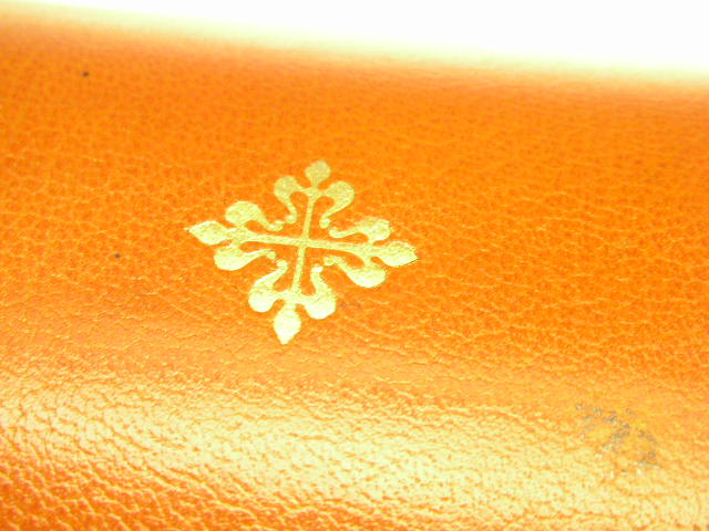 Same as those used for some vintage Patek pieces in the Patek Museum. The similar type of box is also used in Patek’s Old watch books, that makes the whole collection so nice to see, proud to have and own. You normally see the BLACK ones this is the RARER MODEL. Personally love the vintage feel exuded by this vintage orange box. I can't explain it but if you are a serious collector, you will know exactly what I mean. Vintage PATEK Boxes are hard to find, this ORANGE one is harder !!! Search the web and see if you can find another one available for sale? exterior | TOP COVER: This beautiful box is upholstered with ORANGE leather in good condition with light surface wear. When closed, you can see the Patek Philippe’s emblem/logo fashioned in gilt color and inlaid to the box cover on the leather. Look closely and you will see the curves on the four corners of the box, sloping to the sides. ATTENTION TO DETAILS, this is. Inside of the box is lined with high quality suede like material that ensures that your beloved watch will NOT be scratched while you store it away. At the top left corner, there is a frame with letters that reads: PATEK PHILIPPE GENEVE. Look at the joining part of the box, there is not a single gap at all as the designers have laid a layer of leather to cover up all gaps they could find. Original push piece in very good condition. The backbone where the box hinges to open is in good condition.
