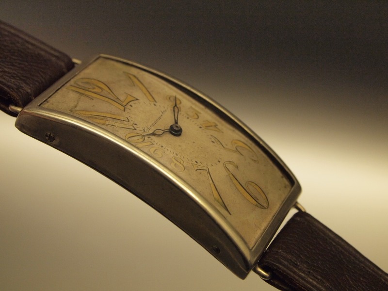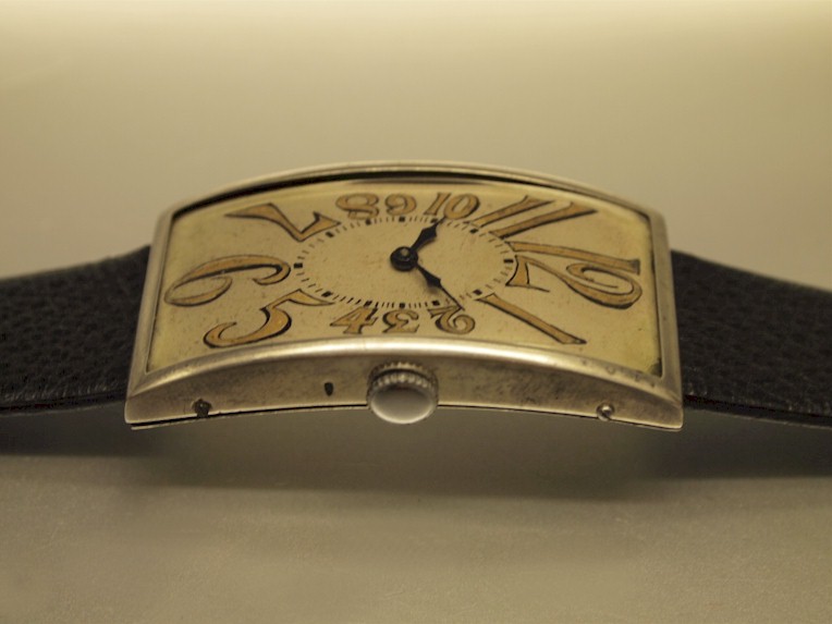 1920s SILVER ART DECO ELONGATED NUMBERS WITH SPECIAL CROWN AT 12:00, FLEXI LUGS Vintage Silver Art Deco watches with LARGE ELONGATED numbers, a.k.a Banana Watch because of its shape are getting rarer these days. This one with its crown at 12:00 is no exception!! Sterling silver curvex, hinged case, circa 1920s. Lovely early vintage art deco, beautiful any angle you look at it!! Even its silhouette exudes beautiful understated charm. D/ Original dial with elongated full numerals aged nicely with charming patina. C/ Original rectangular 0.935 silver case hinged at 6:00 position. The curvex design allows the watch to rest your wrist perfectly. Original old silver crown 6:00, flexi lugs. Measuring 45mm including crown and 52mm long including lugs. M/ Original mechanical winding movement formed to the case, very unique & RARE!