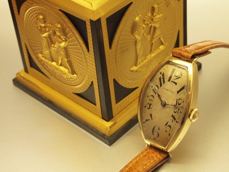 D/ Original dial with black art deco exploding numbers. Signed ELECTA. The full arabic numerals aged nicely with charming patina. Original hands set. C/ Original 18K TONNEAU shape case with wire lugs. Slightly curved at the back. Original vintage crown. Fitted with a beautiful vintage brown strap. M/ Original mechanical winding movement keeps accurate time. Solid gold art deco exploding numbers watches are very hard to come by now, especially one like this with its beautiful original dial !!!