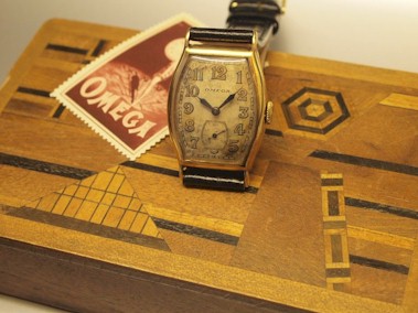 A rare 14K yellow gold vintage 1920s OMEGA art deco timepiece with charming aging & patina. Special tonneau shape case with nice engraving on the side. D / BEAUTIFUL original dial signed OMEGA in its old font particular to the right era (same font used on the movement as well which is similar to that shown on the old Omega advertising material in the picture). Very nice aging & patina add lots of charm to this beautiful timepiece. Large 1 to 12 art deco numerals with smaller font numbers 13 to 24 cleverly & subtly placed in between each larger markers. Complicated yet minimalist. Original blued steel hands set. C/ Nice condition 14k solid yellow gold hinged back case with special engravings on the side. Fully referenced & hallmarked by Omega. The 6Million reference number dates it to 1918-1925. Measures 25mm excluding crown, 26mm including & 38mm lug to lug. M/ Original mechanical winding movement keeps accurate time. The 7 million reference number on the movement dates it to 1920s.