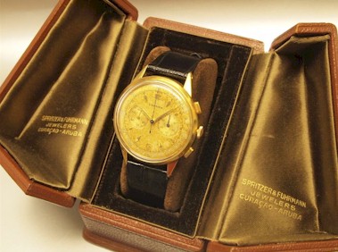 SIGNED ROLEX, ANTIMAGNETIC, REF.2811 CASE NO.040' 799, CIRCA 1937 Rolex. A fine and rare stainless steel chronograph wristwatch with original SALMON dial Signed Rolex, Antimagnetic. + Rolex Box. This is the Rolex's version of the baby chronographe . . . D / Original seasoned salmon dial with 2 registers. Original hands matching the luminous baton and Arabic numerals. Outer railway five minute divisions, outer telemetre and tachymetre scales, two engine-turned subsidiary dials for constant seconds and 30 minutes register. C/ Original s.steel circular case with snap on back case in VERY good condition. Square pushers. Case measures 32x34x40mm. Ref:2811 Case # 040799. M/ Original Rolex Signed mechanical winding movement has just been serviced & timed last week, keeps accurate time and all chronographs functions work properly.A similar stainless steel ref 2811 with a black dial was recently sold by Christie's on 13 May 2013 in Geneva for a whopping CHF50,000 i.e. US$52,423 !!!! ::click here to view auction:: GOING FOR A SONG HERE!!! |