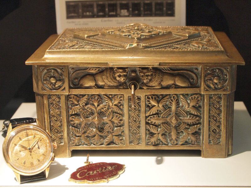 + BOX + BUCKLE Circa 1953 This is an EXTREMELY RARE CARTIER 18K Solid Gold 2 registers 38mm chronograph Circa 1953. IN ALL ORIGINAL CONDITION. This rare Cartier classic timepiece was one of the exotic designs created by Jean Jacque Cartier when he headed Cartier London starting from 1945. Made in collaboration with either Jaeger LeCoultre or Movado with their provenances identified by the special double sets of matching reference numbers engraved both inside the case back and underneath the watch lugs. Search the internet & you would probably only find ONE other piece of this rare early Cartier chronographs available for sale. D/ 100% Original dial with beautiful vintage patina. Original hands set. C/ The original 18k solid yellow gold case with a diameter of 38mm is considered BIG in the 1950s. Matching double sets of reference numbers on the case back & watch lugs. An unique & known way of identifying Cartier's collaborations with other watchmakers. M/ Original Mechanical winding movement has just been professionally serviced & timed.Presented in a beautiful vintage double-door cabinet style brown leather box & vintage Cartier buckle. The equally rare bronze jewelry box from 1880 shown in the pictures is NOT included though.