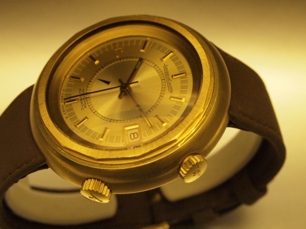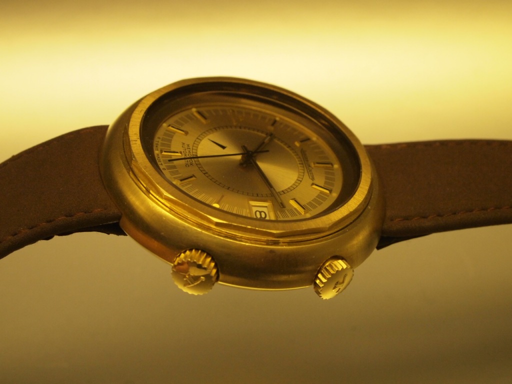 NEAR MINT 18K YELLOW GOLD JLC SNOWDROP MEMOVOX ALARM Is that an UFO? Well, almost! As the sighting of one of this watch in this SUPERB condition is as rare as catching a glimpse of the flying saucer!! Comes complete with its original JLC signed strap & buckle. One piece polished and brushed 18k SOLID GOLD chunky (80 grams) case. D/ Original dial signed JAEGER LECOULTRE MEMOVOX AUTOMATIC SWISS MADE in BEAUTIFUL mint condition. Applied yellow gold and black baton indexes, luminous dots, applied yellow gold JLC logo at 9, inner revolving disc for the alarm, outer minute/seconds division, aperture for the date. Yellow gold and black baton hands. C/ Large 43mm 18k solid gold hooded lugs case in NEAR MINT condition with hallmarks and reference number. Original crowns signed "JL" M/ JLC Signed AUTOMATIC 916 17jewels SPEED BEAT movement keeps accurate time. loud & long alarm !!!!!!!!!