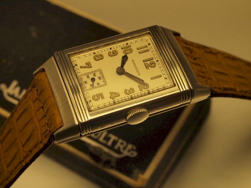 A VERY VERY RARE JAEGER LECOULTRE DUO-PLAN ART DECO WATCH WITH CONCEALED CASE COVER. BACK WINDER TOO !!!!!!! D/ 100% Original black dial with niced aged markers. Signed LECOULTRE DUO PLAN SWISS. Original hands set. C/ 100% original stainless steel rectangular fully hallmarked & signed by JLC. Slide the concealing cover with beautifully engraved monogram to read the time. M/ 100% original manual windingback winding movement keeps accurate time.