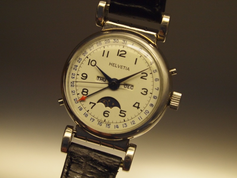 A very cute baby size HELVETIA watch with full calendar and moonphases indications, Ca 1950s. Unique case design with flexible lugs.D / Silvered Dial in good condition. Apertures for Day and Month (in English), Moon & outer blue Date-Graduation. Original hands set with red date pointer. C/ Original stainless steel snap back case fully signed and hallmarked HELVETIA WATCH CY SWITERLAND 4555394. Measures 29mmx 32mm x 40mm. M/ Original mechanical winding Cal. 89 movement keeps accurate time. Tripledate and moonphases functions work properly.PRICE: S$880.00