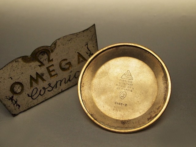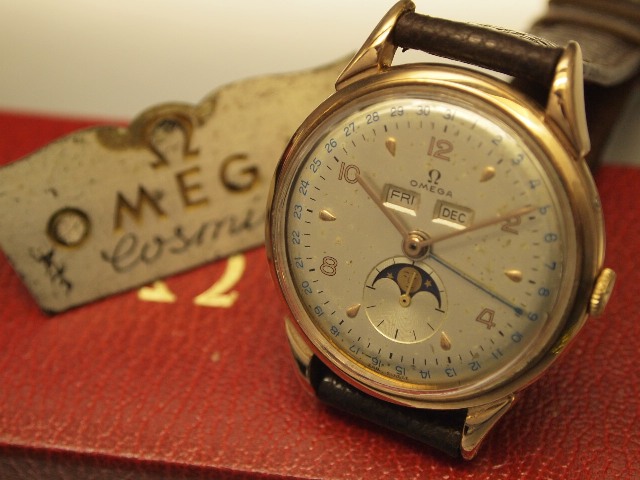 OMEGA COSMIC TRIPLEDATE MOONPHASES LARGER size 36mm OMEGA pink/rose goldplated "Cosmic" watch with full calendar and moonphase. Ca late 1940s. When watches with a full calendar and phases of the moon gained popularity, Omega developed such a model. It was one of the novelties since 1947 and carried the name "Cosmic", which although did not appear on the dial of all the watches, are well known amongst the collectors. Comes with vintage new old stock red Omega watch box. D / Original dial with nice vintage patina. Apertures for Day and Month, Moon & outer blue Date-Graduation. Original hands set with blue date pointer. Personally, love this original baby blue hand. Makes date telling so much more interesting. C/ Original 80 micron goldplated case fully signed and hallmarked "OMEGA WATCH CO. FAB.SUISSE SWISS MADE PLAQUE OR L 80 MICRONS 2486-2". Larger case size measuring 36mm excluding crown, 38mm including & 41mm lug to lug. The smaller model measures 34mmx36mm. M/ Original mechanical winding movement signed "OMEGA WATCH CO SWISS CAL.381 SEVENTEEN 17 JEWELS 11209468, Watch keeps accurate time. Tripledate and moonphases functions work perfectly.