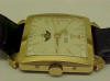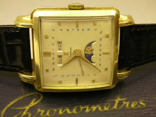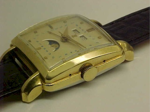 Extremely fine and rare, automatic SQUARE triple date moonphases by GUBELIN Ca. 1950s D: Matt Silver dial with raised gilt five minute marks with light signs of wear. The dial of the watch shows the date by means of a CIRCULATING hand that points at the BLUE date indices just inside of the chapters. Apertures for the days of the week and the months, in ENGLISH. The phases of the moon appear in a crescent just above the six o'clock position. There is additionally a central Sweep second hand. All of the complications can be advanced by means of depressing the buttons on the case sides. C: