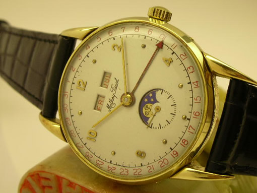 condition goldplated case with steel screw back. D: Fitted with a calendar and SUN phase display. Beautiful original dial in good condition with vintage patina with clear and fully legible details. SUN Phase register for day below 12 0'clock and subsidiary second register at 6:00. Outer Date Graduation. Original set of hands with Original date indicator with red tip. C: Very good condition s/steel case with snap back. Look at the special lugs design. M: Mechanical winding movement keeps accurate time. Quick set buttons work perfectly. Fitted with a brand new unused leather strap. THE LAST I HAD WAS ABOUT TWO YEARS AGO!! VERY RARE