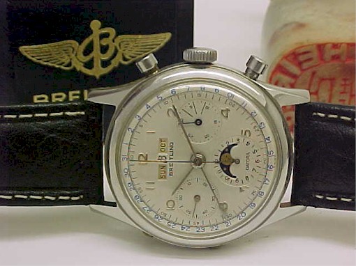WOW !!!! A NEW OLD STOCK 99.99999% MINT Condition LARGE BREITLING "Datora" complicated triple calendar, moonphase chronograph. Housed in a MINT condition LARGE original stainless steel case with Snap back measuring 39mm excluding crown and 45mm from lug to lug. Inner case back is fully signed by BREITLING with reference numbers. 100% original MINT condition silvered dial with gold feuilles hands. 30 Minute Register, applied gold markers and outer blue date graduation. Apertures for Days of the Week, Months (English) and Moonphase. Take a look at the smiling moonphase when you have a hard day at work and see how it turns your frown into a great smile..... SUPER CLEAN MINT Condition Mechanical winding Breitling signed 17 Jewel Movement, Cal. 200 ( Venus ), Shock - Protection " Incabloc ". All technical functions (i.e.timekeeping, tripledate, moonphases and chronograph) work perfectly. What a watch. If you are a serious collector and have always wanted a high grade vintage Tripledate Moonphase Chronograph, your dream does not only come true here but much sweeter as it is a NEW OLD STOCK 99.99999% MINT CONDITION. VERY RARE & HIGHLY COLLECTIBLE !!!!!