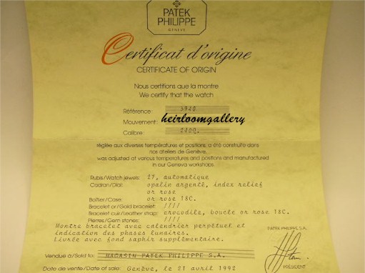 PATEK PHILIPPE 18K ROSE GOLD Patek Philippe's slimmest perpetual calendar ref: 3940. Rose gold, full box & paper. It is the First modern & most iconic Patek Philippe perpetual calendar model, launched in 1985 and produced through 2006. This one we have here is a "ONE OWNER" WATCH purchased on 21 April 1992 !!! Almost like new with all accessories etc. D / Beautiful mint condition original dial showing Day, Date, Month, Moonphase, 24 Hours Indicator & Leap Year Indicator, C/ Original mint condition 18k rose gold case with BOTH see through & solid case backs. Measures 36mm. Sapphire Crystal. M/ Original PP signed automatic ultra-slim cal. 240 movement developed in the seventiesComes with its original double boxes, pusher/corrector, guarantee card, instructions, leather strap, buckle and additional solid back.