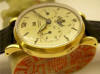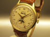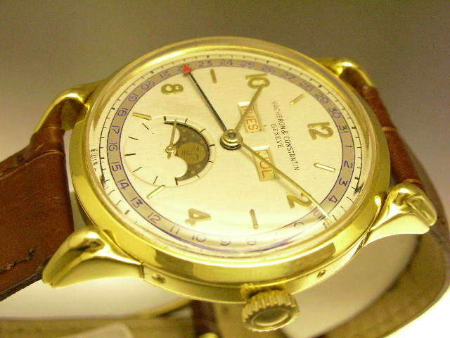 TRICOMPAX CHRONOGRAPH 14DEC07 A VERY Fine and EXTREMELY RARE 18K SOLID GOLD UNIVERSAL TRICOMPAX Ca 1942 gentleman's wrist watch with square buttons chronograph, triple date and moonphases. Universal Tricompax has always been a highly sought after complicated vintage watch, especially so in the current market. This is 18K soIid gold, THE MOST DESIRABLE OF THEM ALL !!!!! D: Original gold tone dial with applied markers showing: subsidiary seconds at 9:00, 30 minutes register, 12 hours chronograph totaliser, the date of the month, outer tachometer graduation, apertures for the days of the week and the months of the year (BOTH IN ENGLISH) and the lunations i.e. moonphases. Matching gold hands with blued steel subsidiary hands. Look at the Red date pointer, it is not only so cute looking it makes date telling a lot easier too !!!!! C: Original SOLID 18K YELLOW GOLD Case with snap back, fully signed and hallmarked by Universal. M: Original UNIVERSAL Signed mechanical winding movement keeps accurate time. All chronograph functions work accordingly. Universal was founded in 1894. It was renamed Universal GENEVE following its relocation to Geneva. Since 1936, Universal has introduced many complicated timepieces and two of the better known ones are aero-compax and Tri-compax. Tri-compax, in particular, was the MOST Complicated timepiece ever produced by UNIVERSAL as it houses complicated movement with complete features indicating time, triple-date, chronograph and moonphases, all in one compact watch case !!!!