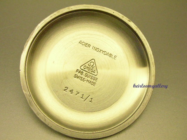 OMEGA SS COSMIC TRIPLEDATE MOONPHASES CAL. 381, Ca. 1949 OMEGA Stainless steel "Cosmic" watch with full calendar and moonphase. Ca 1947s. When watches with a full calendar and phases of the moon gained popularity, Omega developed such a model. It was one of the novelties since 1947 and carried the name "Cosmic", which although did not appear on the dial of all the watches, are well known amongst the collectors. Comes with original Omega signed strap & buckle. D / Original silver Dial in VERY VERY VERY GOOD condition. This is more than 60 years old, mind you. Don't we just hope that we will look this good when we get there? Apertures for Day and Month, Moon & outer blue Date-Graduation. Original hands set with blue date pointer. Personally, love this original baby blue hand. Makes date telling so much more interesting. C/ Original Stainless steel snap back case fully signed and hallmarked "OMEGA FAB.SUISSE SWISS.MADE ACIER STAYBRITE 2471/1". Snap back case measures 34mmx 36mm x 41mm. Original Omega signed crown. M/ Original mechanical winding movement signed "OMEGA WATCH CO SWISS CAL.381 SEVENTEEN 17 JEWELS, Watch keeps accurate time. Tripledate and moonphases functions work perfectly