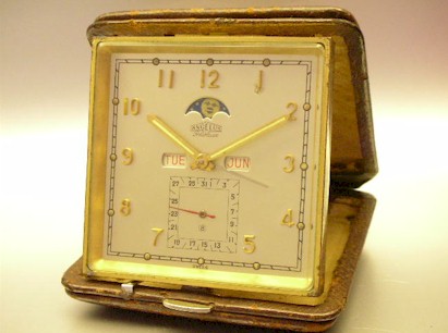 A VERY RARE MOVADO ERMETO Travelling Tripledate Moonphase watch Circa 1940s. C: Original leather covering over goldfilled case with reference numbers 1248 777M. This specially designed case does not only provide protection to the watch it is also equipped with a fantastic mechanism that allows the watch to be wound up when you slide both side cases inwards & outwards. Alternatively you could also wind the watch through the Original winding crown with unique motif design. There is also a ring hook on the side of the watch that allows it to be chained to your suit pocket, like how it was used in the olden days, as evidenced from the picture shown above. The black leather cover in very good condition. The stand on the back of the case is missing but I believe it is a small job that can be done by any silver/goldsmith.The watch measures about 55mm when closed and 80mm when opened. D: 100% ORIGINAL dial with Apertures for DAY and MONTH and moonphases. Original hands set with Circulating indicator hand with round dot for the date, makes date telling easier at a glance. The original dial is in good condition with only light signs of wear. It is signed MOVADO SWITZERLAND with gold tone applied numbers and dates in its original perfect mint blue color. M: Mechanical winding movement runs but would recommend service/cleaning. The day, date and moonphases functions operate properly. Quickset buttons for DATE, MONTH and Moonphase disc also work properly. When closed the leather covered side case protect the watch whilst you move... Discard your table calendar and tell time and date in style with this unique creation.