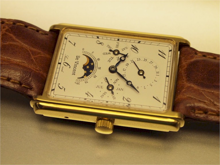 IWC 18K Y.GOLD NOVECENTO A MINT CONDITION, just serviced (Dec 2011) complicated wristwatch with very simple design, By IWC. It is also the FIRST rectangular AUTOMATIC PERPETUAL CALENDAR ever made. Most perpetual calendar watches have correctors/pushers at the side of the watch for quickset/corrections purposes and require some skills & care when you want to change the date etc. This is an early example of solution to the above headache, as all changes are made through the crown...quite an interesting piece. I personally like the rectangular case exuding the simplest dial construction in a perpetual calendar wristwatch you can find, add variation to your other circular cased perpetual calendar moonphases......