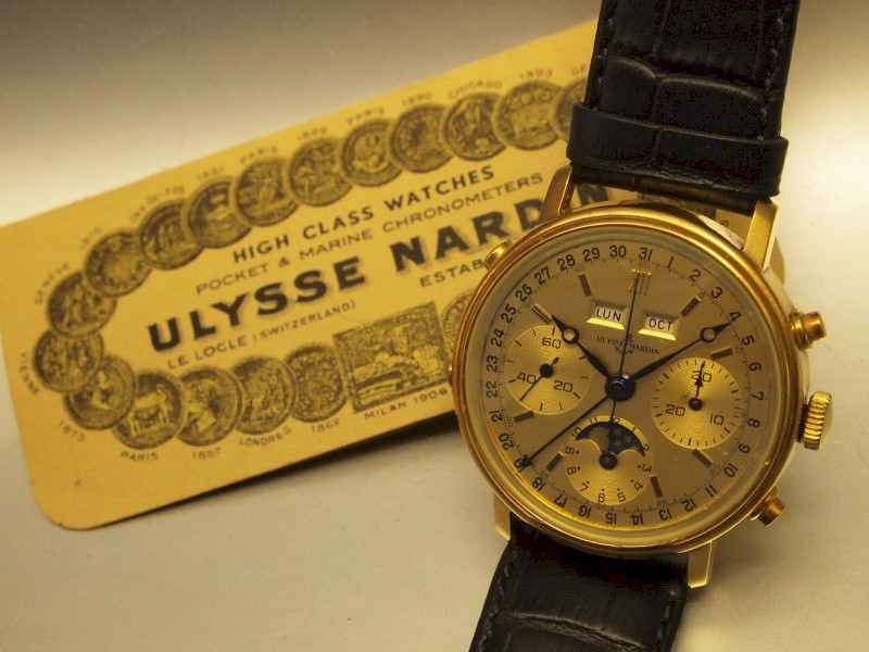 Extremely Rare vintage Ulysse Nardin 18k solid gold Tripledate Moonphase chronograph with beautiful original dial and chunky solid gold case. Circa 1960. Comes with its original wooden UN presentation box. D/ 100% Original dial in beautiful condition signed ULYSSE NARDIN SWISS MADE. DAY & MONTH apertures below 12:00. 30 minutes counter at 3:00 and subsidiary seconds register at 9:00. Moonphases indication & 12 hours totaliser at 6:00. Original blued steel hands set. Original Calendar hand. C/ Original 18k solid gold top case with screw back back case. Original Crown, Original pushers and protruding Correctors. Huge heavy & chunky case. M/ Original Valjoux 88 Mechanical winding movement. Keeps accurate time, all chronograph and tripledate moonphases functions work accordingly.