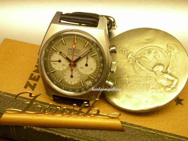 The world's FIRST AUTOMATIC chronograph.produced by Zenith in their close race with the Buren Group (Heuer, Breitling, Hamilton and Buren) to create and market the world's first automatic chronograph. A true piece of chronograph history. Circa 1969/71. D / Original dial in VERY VERY GOOD condition. With luminous markers, aperture for DATE at 4.30 o'clock position. Luminous hands. I personally fancy the red chrono flyback hand. C/ Original tonneau shaped case Diam. 37 mm excluding crown, 40mm including, lug to lug 42mm.Original Zenith crown with its famous STAR logo. Outer case back with a large logo and inner case back signed as well. M/ Thirty-One jewel automatic column wheel chronograph movement fully signed and marked 3019 PHC with the rotor marked ‘Zenith 31 jewels Swiss Made’. |