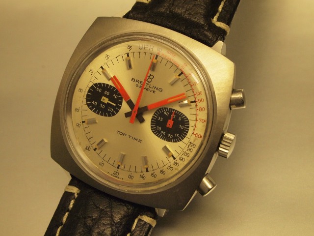 TOP TIME TV SHAPE CHRONO Super retro Breitling cushion/TV shape TOP TIME 2 registers chronograph with orange hands. D / Original nice condition silvered dial signed BREITLING GENEVE TOP TIME SWISS MADE. Original orange hands set. C/ Original stainless steel screw back case with full hallmarks & reference. M/ Original Breitling signed movement keeps accurate time & all chronograph functions work properly. |