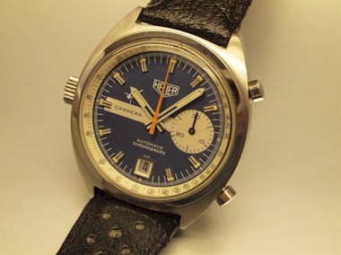 AUTOMATIC CHRONO D / Original Beautiful near mint condition blue dial signed HEUER CARRERA AUTOMATIC CHRONOGRAPH SWISS, date at 6:00. Original hands set. C/ Original stainless steel screw back case. Fully signed & hallmarked. M/ Original Heuer signed Automatic movement keeps accurate time & all chronograph functions work properly. |