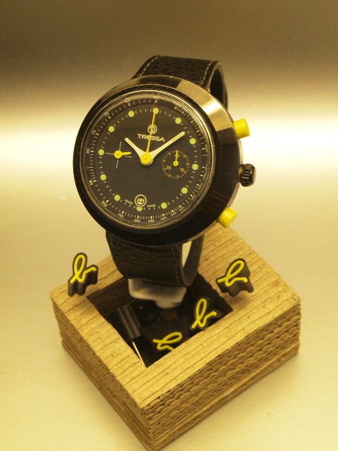 D / Original near mint condition matt black dial with round dot markers. Super retro original white hour & minute hands with rounded edges. Yellow chronograph, subseconds and 45 mins counter hands, matching the original yellow pushers perfectly. Dial signed TRESSA, Swiss Made in between the round date aperture. Register at 3:00 counts to 45 minutes, 9:00 register shows constant seconds. C/ Original black PVD case with s.steel screw back case. Original crown & pushers. Look closely and you will notice that the case is NOT exactly round, rather the dial is off-center giving a lopsided effect. Measuring 45mm excluding & 48mm including crown. M/ Swiss Made, manual winding valjoux chronograph movement. Keeps accurate time & all functions work properly.Just love the roundedness of this unique timepiece from its case to its hands & every little detail & the touch of yellow . . . |