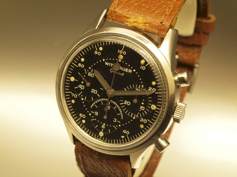 Vintage Witnauer Professional 2 registers chronograph with unique register at 3:00 & chocoloate brown bezel.