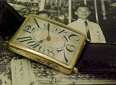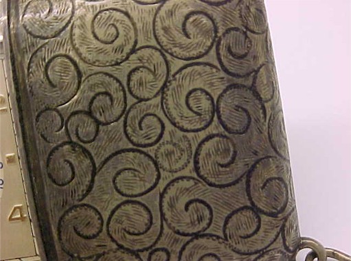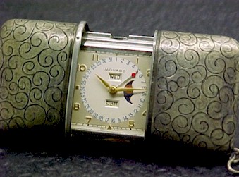 Crafted in a very nicely engraved silver case with beautiful motifs. The beautiful case does not only provide protection to the watch it is also equipped with a fantastic mechanism that allows the watch to be wound up when you slide both side cases inwards & outwards. Original Case with reference numbers. Original winding crown with unique design. There is also a ring hook on the side of the watch that allows it to be chained to your suit pocket, like how it was used in the olden days, as evidenced from the picture shown on the left. SUPER MINTY 100% ORIGINAL dial with Apertures for DAY and MONTH and moonphases. Original Circulating indicator hand with RED dot for the date, makes date telling so easy at a glance. All original Beautiful SUPER MINT dial with numbers and dates in its original perfect mint blue color. Mechanical winding movement keeps perfect time and all day, date and moonphases functions operate properly. When closed, the case protect the watch whilst you are on the move...When opened, there is a hinged stand on the back that allows the watch to be placed in a standing position....and it has been standing gracefully in my display shelf since. Most MOVADO ERMETOs I have seen are with leather case, this is a very fine and rare example that will sit prettily in your pocket or on your desk. Discard your table calendar and tell time and date in style with this unique creation.
