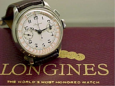 A very fine and rare, stainless steel gentleman's wristwatch, with single button chronograph by Longines Ca.1920s. White porcelain dial with painted arabic numerals, auxilliary seconds and 30 minutes register dials, outer tachometers graduation with special design. "Breguet" hands. Dial, case and movement signed. Chronograph of this design with porcelain dial is getting harder to come by now. Case measures 32mm x 38mm. Very nice combination of red and black with an arty look.
