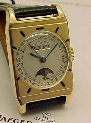 An important and EXTREMELY rare 18K Solid Gold (you usually see the 10k goldfilled version) LeCoultre Rectangular Tripledate moonphase Ca 1940s in near mint condition. Officially referred to as "LECOULTRE", launched in 1949 In tribute to Jacques-David LeCoultre. The watch is housed in 18K Solid Gold hinged back Rectangular case with black enamelled markers. Fitted with a calendar and moon-phase display, the "LeCoultre" houses the renowned manually wound Calibre 486 movement. Beautiful original LeCoultre dial with apertures for day and month below 12 0'clock and moonphses indication at 6:00. Original Circulating red pointed calendar hand with clear and fully legible date numbers 1 to 31. Original blued steel hour, minute and second hands. Subsecond register at 6:00 position showing the second that ticks away...