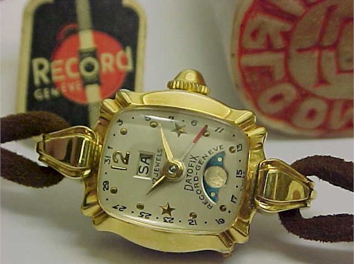 An Extremely rare Vintage NEW OLD STOCK RECORD DATOFIX Ladies' Moonphase Calendar watch Ca 1951. Rose goldplated ( 20 Micron ) Cocktail case with stainless steel snap-back in near mint condition. Silvered original Dial in MINT Condition with apertures for Moonphase and Month, outer date graduation with red indicator. Yellow Gold Markers and Stars, yellow Gold Index Hands Mechanical winding movement signed Cal 75 Record Watch Co Swiss 17 jewels.