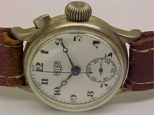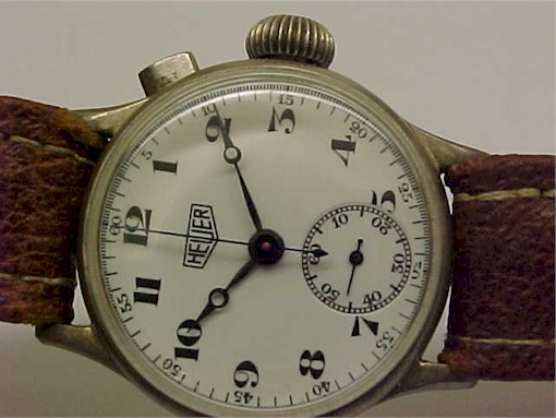 ENAMEL DIAL CHRONO, SINGLE BUTTON A very fine and rare gentleman's one pusher porcelain dial chronograph by Heuer Ca.1932. White porcelain original dial with colorful outer green, red and blue Tachymeter Graduation, blued Steel Index-Hands.30Minute Register at 3:00. 17 Jewels Movement, Caliber GHT (Valjoux).