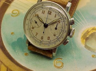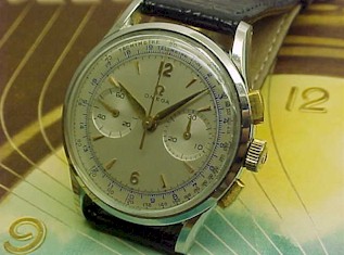 Vintage Ca. 1940s smaller size (diam.33mm) winding mechanical chronograph by Omega in superb condition. Near mint stainless steel case. Original Olive pushers. Beautiful dial with luminous hands. Chrono fans will definitely fall in love at first sight with this rare boy size or better known as 3/4 size chrono .....I did...