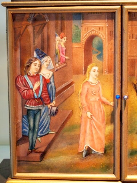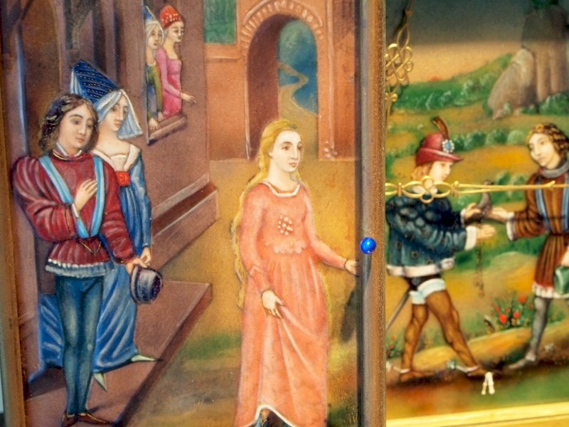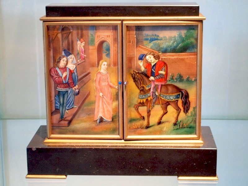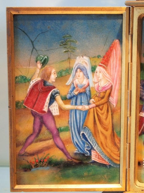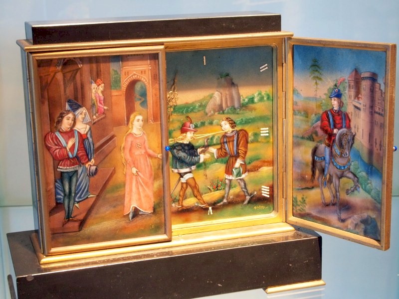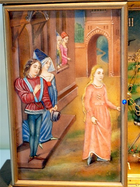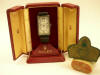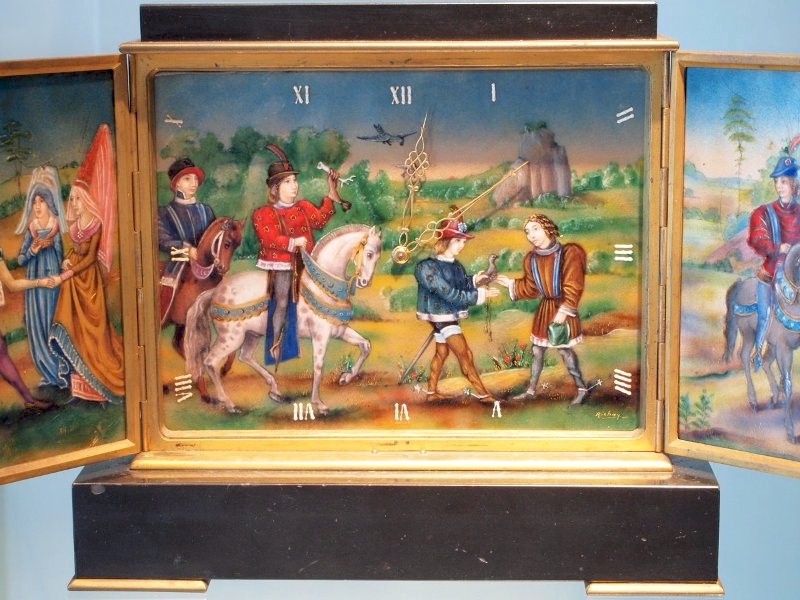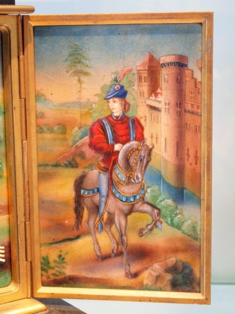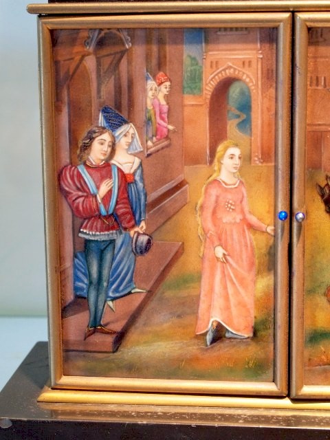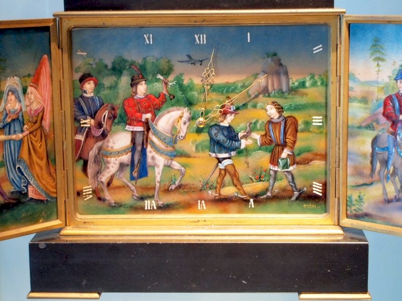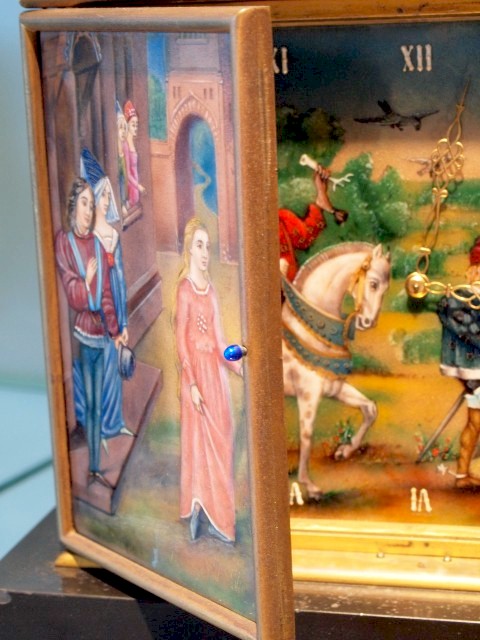 Is it a clock? A painting? Or Both? It is a beautiful piece of TIMELESS ART !!!! Well, this is probably one of "that" particular timepieces that make my heart sing!!! Can you blame me??? Look at the colorful enamel dial & panels which are fully decorated with intricate details, so rich, so bright, so refined & exquisite !!!!! Enamel clad figure decorated doors (4 panels) that open to reveal an enamel triptych interior. The beautiful dial with very nice scenery is adorned with roman numerals & special hand sets. Black Belgian marble base. H 6 1/2", W 3", L 7 1/4". It runs 8 days on each full wind . Chimes every half hourly & hourly & when it does, you see me smile......yes ! My heart sings !! No words can describe this special item accurately, so I will let the pictures do the talking (the last two pictures amplify the desire to sing louder) ........very nice !! These particular models of painted enamel clocks represented the best examples that could be offered at the time. Not only did the manufacturer take the time to make sure that each of the panels were decorated on the inside, they decorated the outside panels as well. ONLY 2 OTHER EXAMPLES HAVE EVER BEEN HANDLED BY ANTIQUORUM, THAT IS HOW RARE THIS IS and may indicate that these were made either for a special exhibition or on special order only. The second piece by Antiquorum was auctioned for HKD237,500!!! approximately SINGAPORE$46,000 on 25 June 2011.
