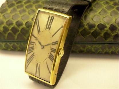 An Early Very fine and Extremely Rare curved oversize rectangular, silver gentleman's wristwatch by ROLEX yes ROLEX !!!!! Circa 1915. Massive, hinged back, wire lugs silver case measuring 28mm excluding crown, 30mm including and 55mm from lug to lug !!!!! Original off-white dial, with painted exploding Arabic numerals, "Spade" blued steel hands. Dial, case and movement signed Rolex. A very important art deco example.....and it is from ROLEX !!!!! Fitted in an EXTREMELY RARE Original Vintage ROLEX presentation box. A similar Rolex example in gold case was auctioned off by Sotheby's in 2003 for EURO 50,000 and this item also made it to the cover page of the catalogue of the particular auction, indicating its importance and rarity.........