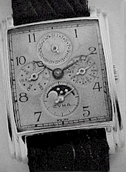 AUTO MOONPHASES Matt Silver dial with raised gilt five minute marks, inner date ring with central date hand, apertures for the days of the week, the months and the lunations i.e. moonphases. Sweep second hand. Huge Square case with special lug design and domed crystal.