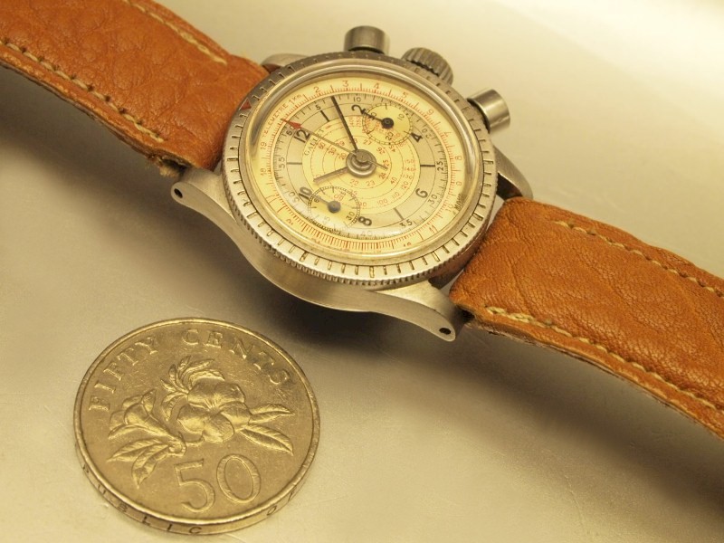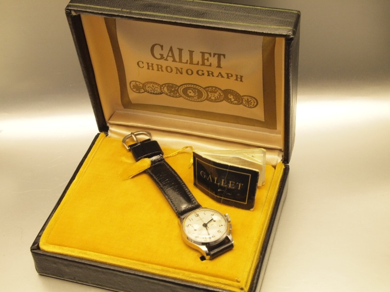 THE WORLD'S SMALLEST CHRONOGRAPH, AKA BABY CHRONOGRAPH. ONLY 26mm !!!!!!!!!!!!!!! SMALLER THAN A SINGAPORE 50 cents COIN!! Produced in 1939 as part of Gallet's long tradition of enabling professional and enlisted women to excel at tasks generally assigned to men - This is the smallest and one of the finest 20th century time recording wristwatches. Due to the general perception and resistance to "women doing men's jobs", the MultiChron Petite remains as an extremely scarce wristwatch, as very few examples were ever produced, rendering these extraordinary timepieces highly valued as rare and important items by today's collectors. D / Mint condition original dial. Full arabic numeral markers with matching original blued steel hands set. Subsidiary seconds register at 9:00 position. 30 minutes counter at 3:00. C/ Original mint condition stainless steel snap back case. Fully hallmarked & signed by GALLET. Measuring only 26mm excluding crown !!! M/ Original Gallet signed Mechanical winding valjoux 69 movement in super clean and perfect working condition.NEW OLD STOCK + ORIGINAL PRESENTATION BOX + ORIG PAPER !!