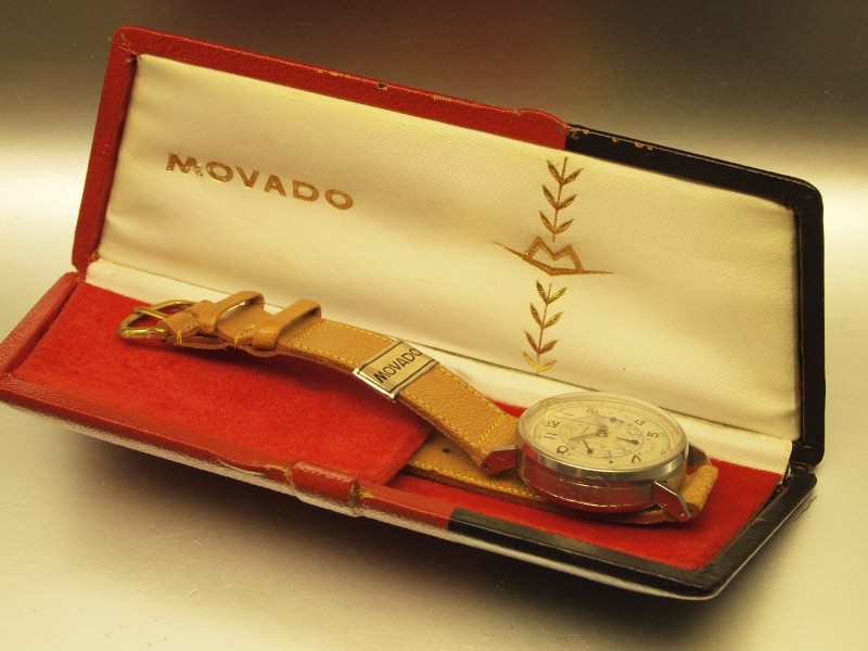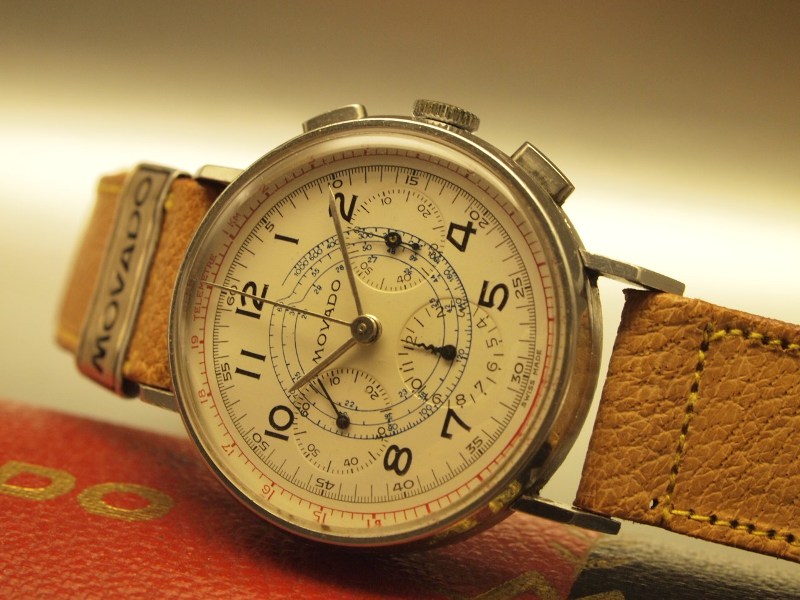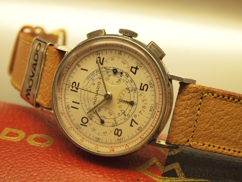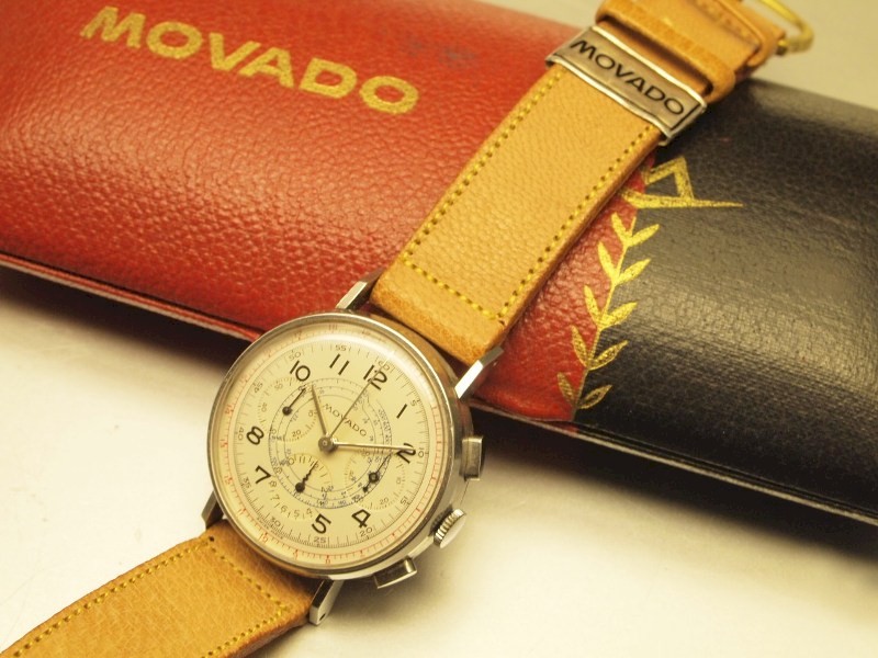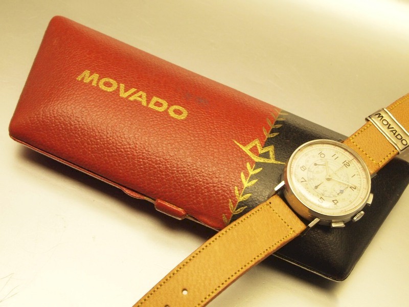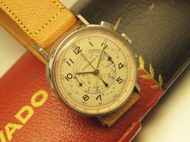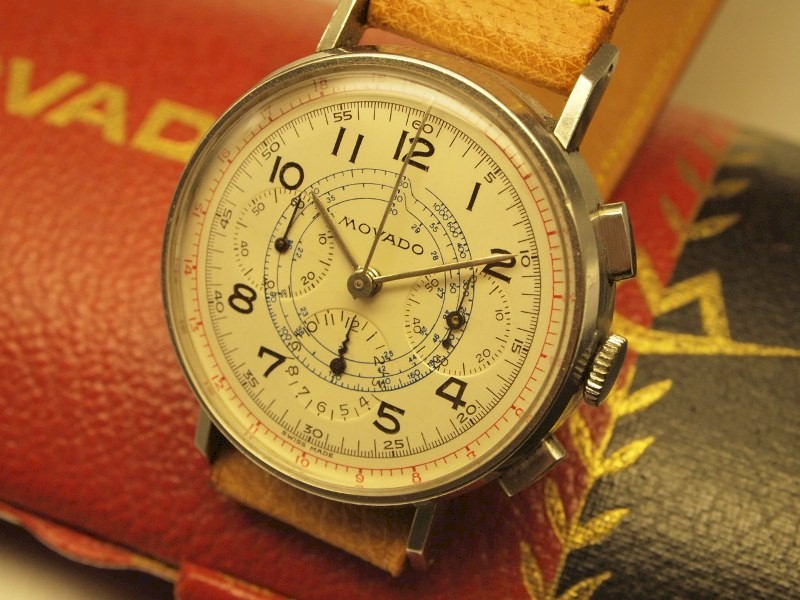 A very small size three registers vintage BABY chronograph by Movado in MINT condition. Presented in its original vintage watch box, in very unique shape.D/Beautiful clean complicated dial with nice combination of blue and red on silver. 3 Registers with 12 hours totaliser at 6:00. Original hands set. Look at the unique shape of the blued steel hand at 6:00!!! C/ Small baby size original stainless steel snap back case in near mint condition. Original Olive pushers and original crown. Measuring only 28mm excluding crown!!! M/ Super complicated original 12 hours chronograph movement.