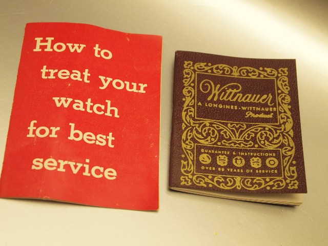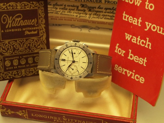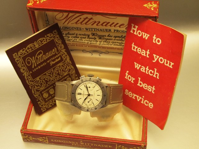 D/ Mint condition dial with black details. Original hands set. Subsidiary seconds register at 9:00 position. 30 minutes counter at 3:00. C/ Original mint condition stainless steel snap back case with sharp & crisp edges. Fully hallmarked & signed. Measuring only 28mm excluding crown. Original crown and olive pushers. I just LOVE the rotatable bezel with engraved numbers 1 to11 with a black triangle at 12:00 position. M/ Original Witntnauer signed Mechanical winding valjoux 69 movement. NEW OLD STOCK + ORIGINAL PRESENTATION BOX + ORIG GUARANTEE CARD + BOOKLET EXPLAINING THE CARE NEEDED . . . AS COMPLETE AS THE DAY THIS LITTLE BABY WAS BORN...