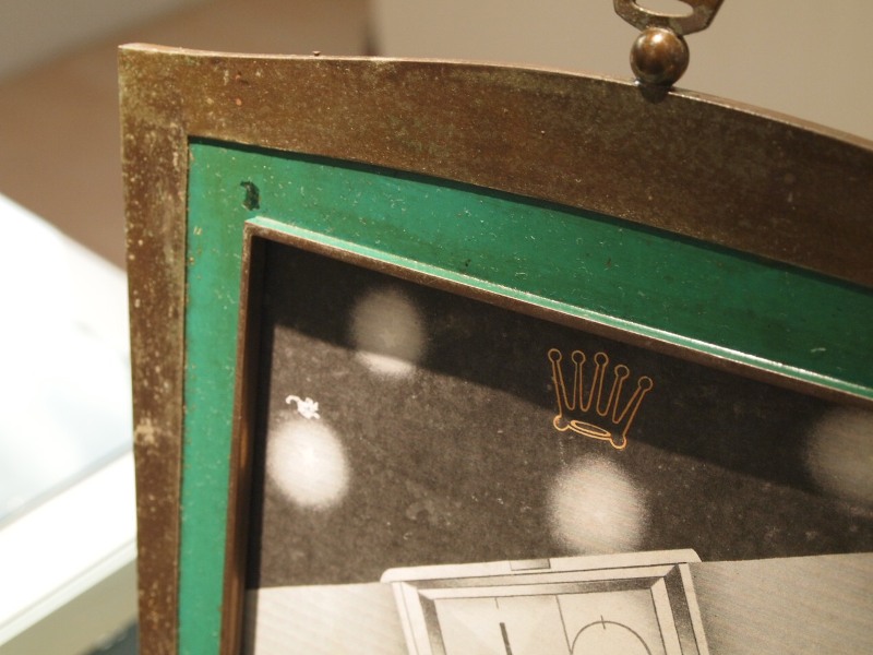 This is an EXTREMELY RARE LARGE original vintage Rolex window display. Circa 1960s but perfect to showcase any picture, poster or advertisement of your favourite Rolex watch. AUTHENTIC VINTAGE ROLEX HISTORICAL ITEM. This handsome Rolex display looks good on its own & better as a poster or picture frame of your favourite Rolex Watch. Made of gilt brass, partially painted in green soft enamel. Large Rolex crown at the tip of the display. The back of the display has an wooden easel allowing it to tilt at a photo frame angle. The wooden easel is held onto to the main brass body with pins/nails inserted into the tiny holes on each side of the cut-out window (currently held together with 4 newer pins). The easel allows the display to tilt at a very nice angle, allowing perfect & proud visual connection when displayed on the counter or table. Measuring 26.5cm by 26.5cm excluding the Rolex Crown. The Photo section is 19cm by 19cm. Overall very very very nice vintage condition with time related natural aging on the wood, gilt brass & some very light signs of wear on the green enamel which adds vintage charm & evidencing its age.