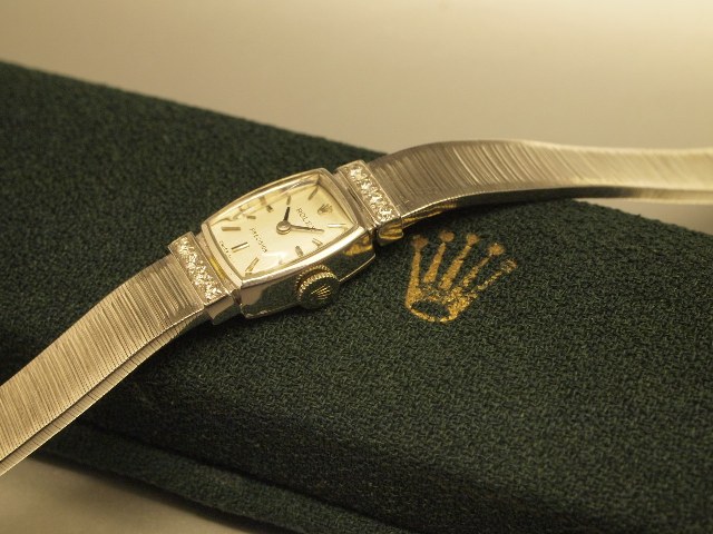 N ice condition beautiful vintage 18k ROLEX PRECISION watch with sparkling diamonds !!!!C: Original 18K yellow gold case with Unique diamond cut design on the side. Inner Case is fully signed, referenced with 18K hallmark. 24 original sparkling diamonds on the bezel. D: Mint condition silver dial signed ROLEX PRECISION SWISS. Applied Rolex crown logo and applied markers. Original hands set. M: Mechanical winding Swiss made ROLEX signed movement, sets, winds properly and keeps accurate time. Fitted with a matching generic gold tone bracelet. A PERFECT GIFT FOR YOUR LOVED ONE, FROM ROLEX. YOU CAN'T GO WRONG WITH THE 24 DIAMONDS...............