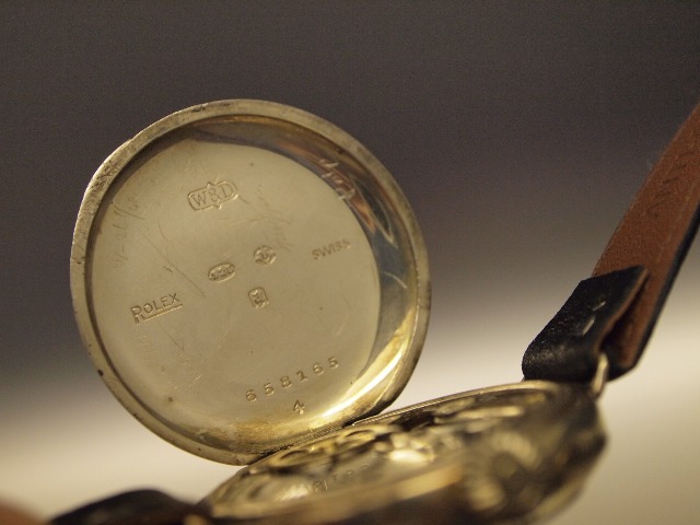 D / Original pearly white porcelain dial with arabic numerals. Original blued steel skeleton hands. Sweeping seconds hand. C/ Beautiful condition original sterling silver case with hinged back case fully signed & hallmarked by ROLEX. In 1905, Hans Wilsdorf and his brother-in-law Alfred Davis founded "Wilsdorf and Davis" in London. Their main business at the time was importing Hermann Aegler's Swiss movements to England and placing them in quality watch cases made by Dennison and others. These early wristwatches were sold to jewellers, who then put their own names on the dial, which explains the lack of logo on the dial. The earliest watches from Wilsdorf and Davis were also usually hallmarked "W&D" inside the caseback, as in this one. In 1908, Wilsdorf registered the trademark "Rolex" and opened an office in La Chaux-de-Fonds, Switzerland. The company's name "Rolex" was registered on 15 November 1915. Fixed wire lugs fitted with a beautiful vintage strap. M/ Original ROLEX signed mechanical winding movement keeps accurate time.