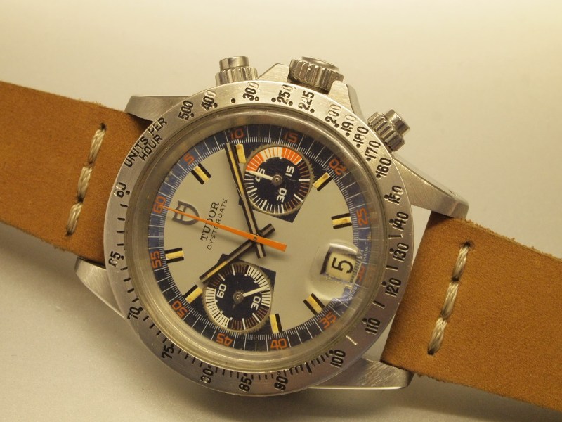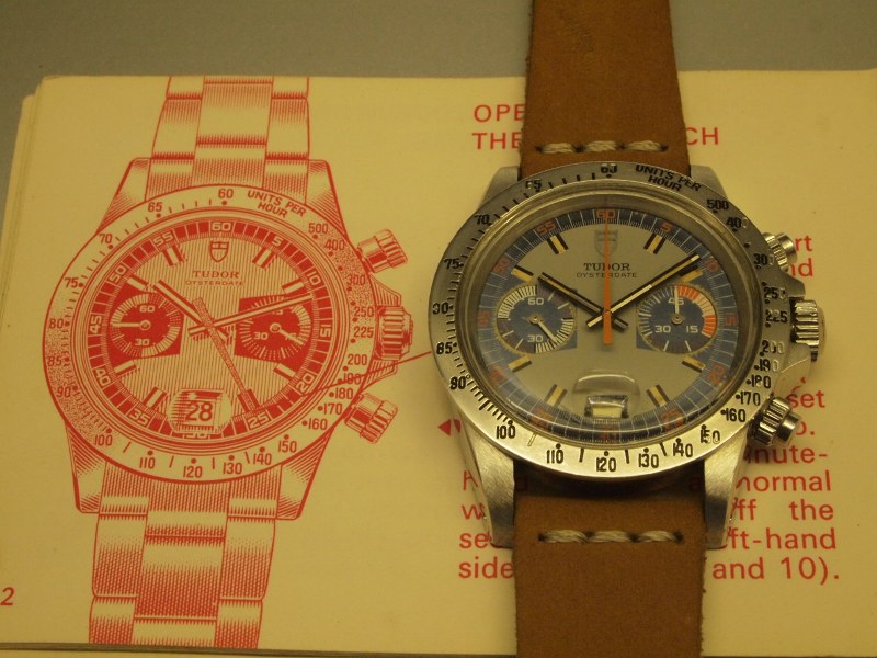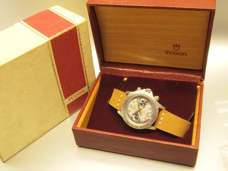 A very rare early TUDOR chronograph, from the 1979. a.k.a Monte Carlo in reference to the roulette wheel like alternating colored seconds chapter on the dial. Complete with its original guarantee paper dated 20 DEC 1979 and rare original instructions manual, box and bracelet. Probably a 1979 X'mas gift . . . lucky fella..... D/ Original dial with luminous markers. In very good condition. Original luminous hands set with Orange chronograph hand. Subsidiary seconds at 9:00, 30 minutes chronograph counter at 3:00. Signed TUDOR OYSTER DATE T SWISS MADE T. Date aperture at 6:00. C/ Original stainless steel case in near mint condition. Screw back case. Screw down pushers. Very Good condition bezel. M/ Original mechanical winding TUDOR Signed 234 movement . Keeps accurate time and all chronograph functions work properly.