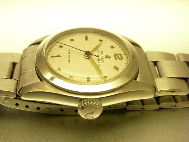to the lugs. Nice large crown. M: Original Rolex Signed Mechanical winding movement. Keeps accurate time.