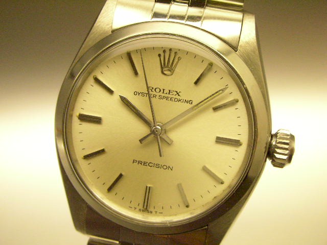 ROLEX OYSTER SPEEDKING + ROMAN NOs A very cute looking Vintage ROLEX OYSTER SPEEDKING PRECISION with special Roman numerals and pencil hands. Special engines turned bezel. Reference 6220. D: Original dial signed ROLEX OYSTER SPEEDKING PRECISION SWISS MADE. Luminous ROMAN numerals at 2,4,6,8,10 and 12 .Original luminous PENCIL hands. Sweep seconds hand. The dial has some light signs of wear and patina but still very charming, especially love the combination of pencil hands with the luminous markers. C: Excellent condition Oyster case back with the screw track in good condition. Very nice condition solid steel bezel with engine turned effect and 13 (11+2 at 12:00) raised markers. Case back with inscriptions, old ROLEX logo which looks so adorable and 2 sets of reference numbers. 6220 and 11.54. Case measures 30mm excluding crown, 34mm including and 35mm from lug to lug. Original screw-down ROLEX crown in very good condition. M: Original 17 jewels ROLEX signed Mechanical winding movement sets and winds perfectly and keeps very good time. The movement is signed "MONTRE ROLEX SA SEVENTEEN 17 JEWELS GENEVA, ADJUSTED TO 2 TWO POSITIONS 15581 PATENTED SUPERBALANCE. Fitted with a very charming vintage brown leather strap that matches the dial of the watch perfectly. Presented in our in house watch box for your collection.