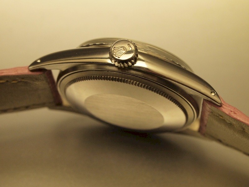 B eautiful Rolex Cameleon in 18k solid white gold with special case design, with a pink strap & Rolex buckle.D/ Mint condition dial signed ROLEX Orchid SWISS. Original hands matching the markers perfectly. C/ Housed in its Original 18k solid white gold case with special design at the side. The outer side of the back case has a VERY CLEAR & CRISP Rolex Crown Hallmark with reference number, UNPOLISHED ORIGINAL CONDITION. Inner Case is fully signed, referenced with 18K hallmark. Original ROLEX Signed Crown. M/ Original High Grade Rolex signed 18 jewels Mechanical Winding movement, just serviced and keeps accurate time.