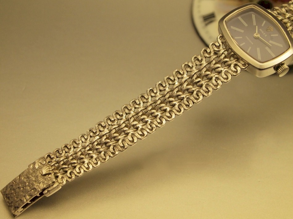 18K white gold bracelet . Circa 1950s. Some ladies would rather keep their wrist "bare", leaving space for a beauty like this. Presented in its original Rolex Clamshell Box. Perfect!