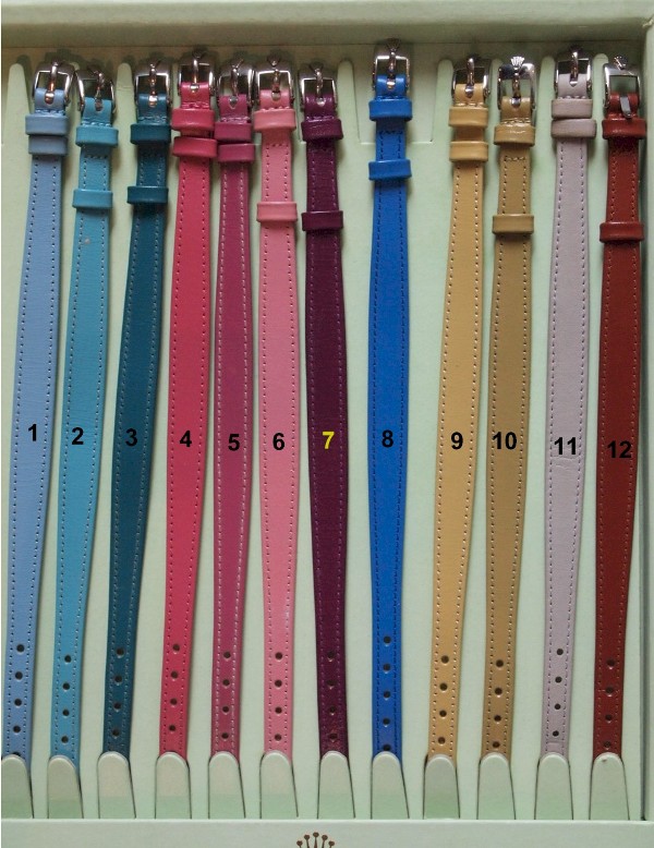 Ladies, besides getting yourselves new dresses, shoes & hand bags, how about a change of strap for the beloved Rolex Cameleon of yours? With so many colors (some exotic ones) to choose from, this is one rare chance for you to do just that with these VINTAGE NEW OLD STOCK ROLEX CAMELEON STRAPS!! Limited stock of yellow, red, brown, pastel green, purple, blue, grey, beige, pink, baby blue, black & many many more ......... Hurry, while stock last !!!!! Please see last two pictures to select the colors (#1-24) that you like. 100% ORIGINAL Rolex straps with 100% ORIGINAL Rolex buckle. NOT COPY, NOT AFTERMARKET, 100% AUTHENTIC !! PRICE:S$200.00 EACH