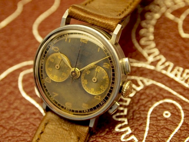 VERY Good condition complicated original BLACK dial with 2 registers AND SPIRAL TACHOMETER SCALE. Subsidiary Second register at 9:00 position, 45 minutes chrono register at 3:00 position.White hands set ORIGINAL to the watch. The hands together with the details on the dial & Luminous numerals provide a very nice contrast over the black dial. Good condition stainless steel case (diameter 29mm) with snap back. Square pushers start, stop and reset properly. Special formed OVAL shape Mechanical winding movement keeps perfect time and all chrono functions work properly. Fitted with a Vintage leather strap.