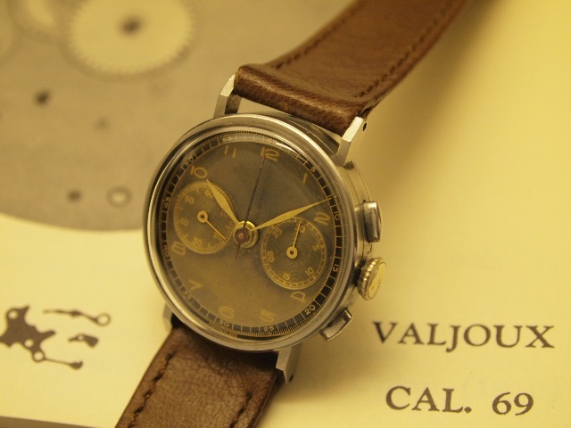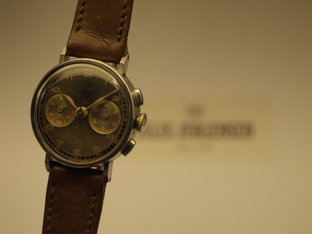 JULES JURGENSEN VALJOUX 69 BABY CHRONOGRAPH D/ Original aged 2 tone dial, signed Jules Jurgensen SWITZERLAND with gold registers. Original hands set. Subsidiary seconds register at 9:00 position. 30 minutes counter at 3:00. C/ Original excellent condition stainless steel snap back case. Fully hallmarked & signed. Measuring only 28mm excluding crown. Olive pushers. M/ Original Jules Jurgensen signed Mechanical winding valjoux 69 movement keeps accurate time & all chrono functions work properly. Part of our Private Collection - NOT FOR SALE.
