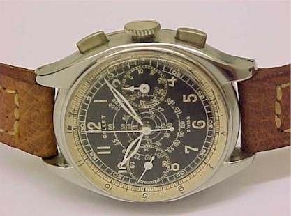 This example in our collection is the rarest petite version of the gent's Pilot model, 30 minute recording chronograph, specially designed for lady pilots with rotating 12 hour bezel for time zone calculations during flight, tachometer and telemeter scales on dial, powered by a 10 ligne Valjoux calibre 69 movement. Its huge round pushers makes this baby looks so cute and adorable to hold and wear. Beautiful perfect condition 100% original complicated dial. 28mm.....hmm...sometimes size does matter .............. Guess what, this exact SAME example of mine is being featured in Gallet's official website. Take a look :O)ref No:GALLETBABY | PRIVATE COLLECTION | new additions
