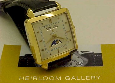 AUTO MOONPHASES Matt Silver dial with raised gilt five minute marks, inner date ring with central date hand, apertures for the days of the week, the months and the lunations i.e. moonphases. Sweep second hand. Huge Square case with special lug design and domed crystal.